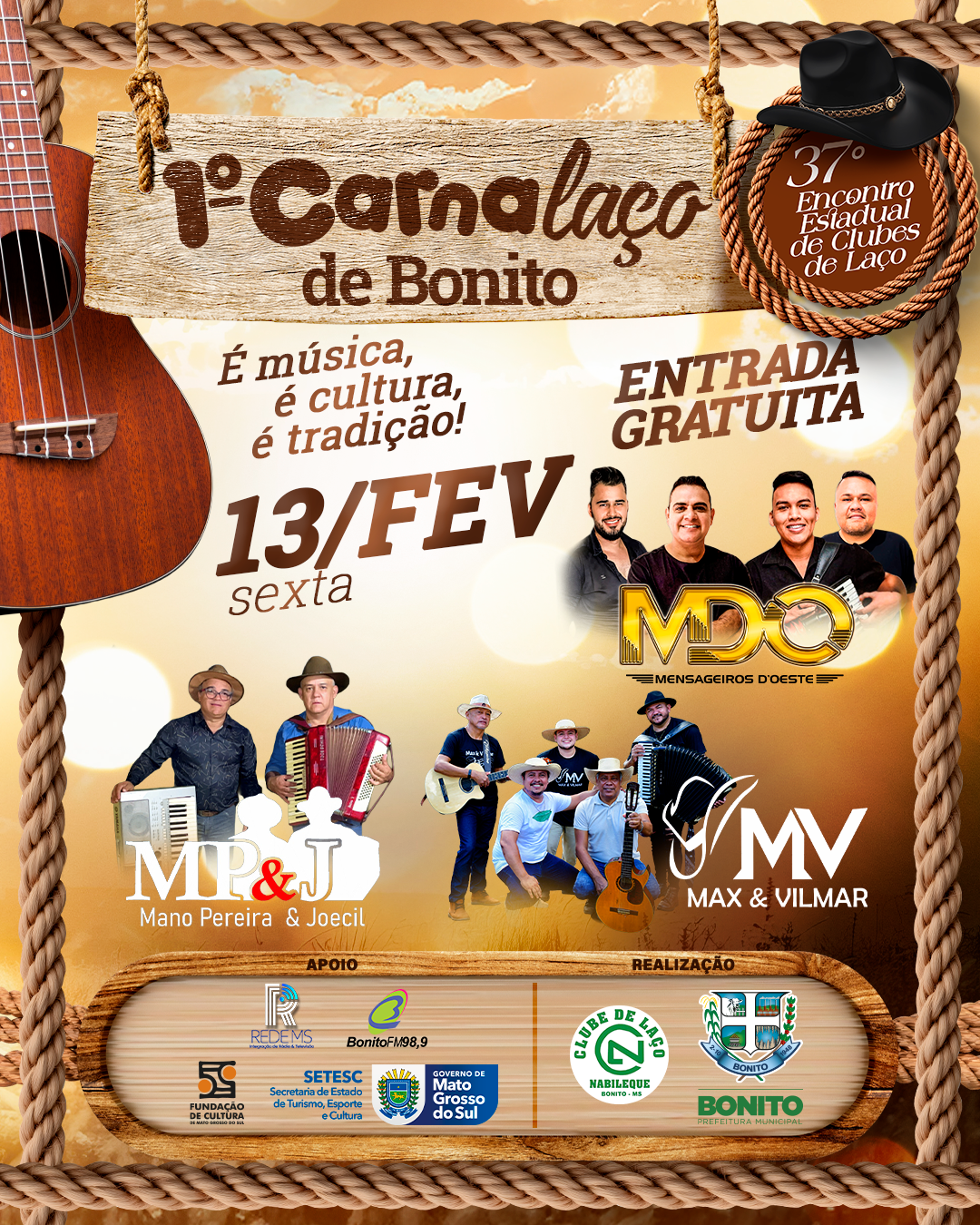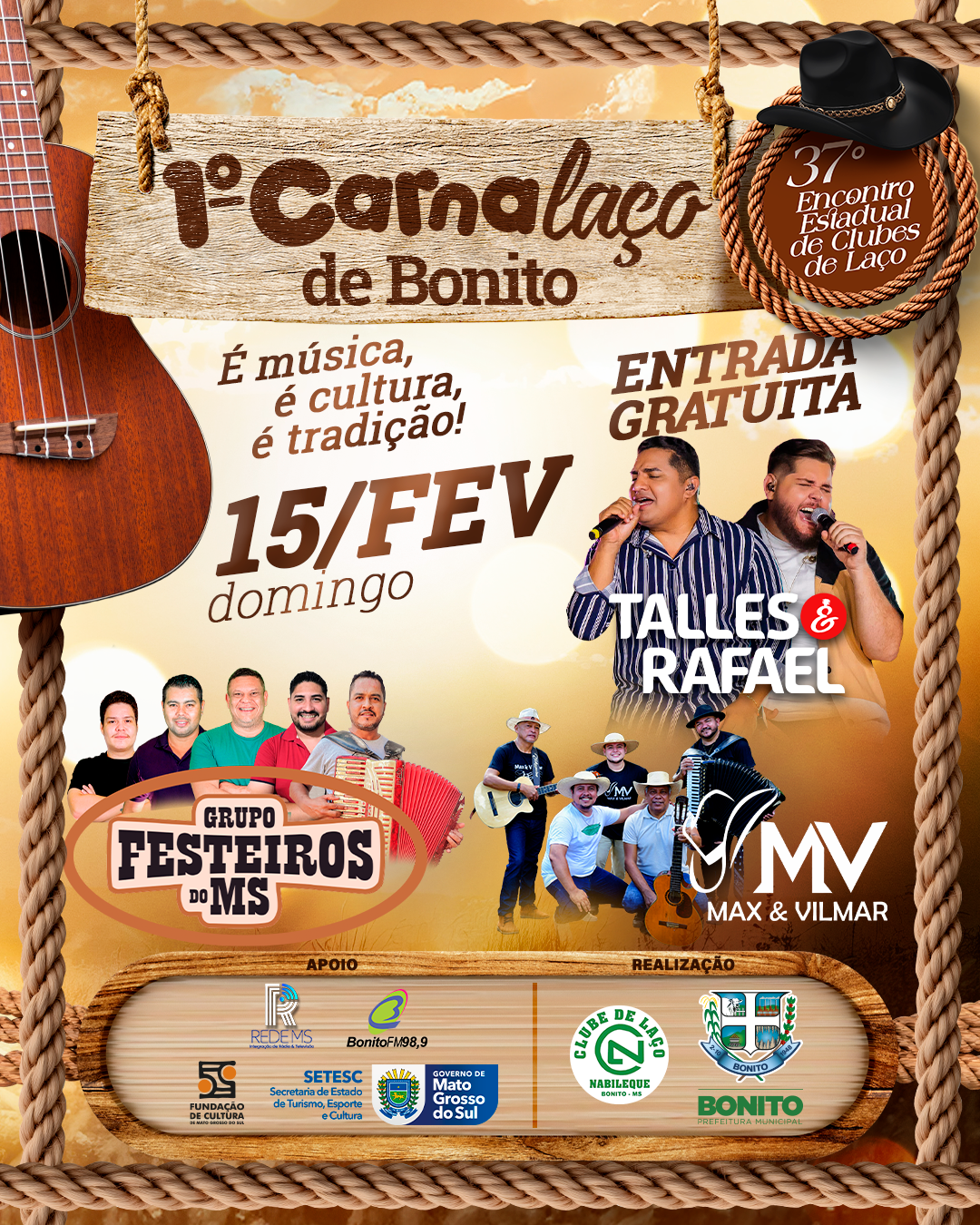 De 12 a 15 de fevereiro de 2026, Bonito realiza o 37º Encontro Estadual de Clubes de Laço, no Clube do Laço Nabileque.