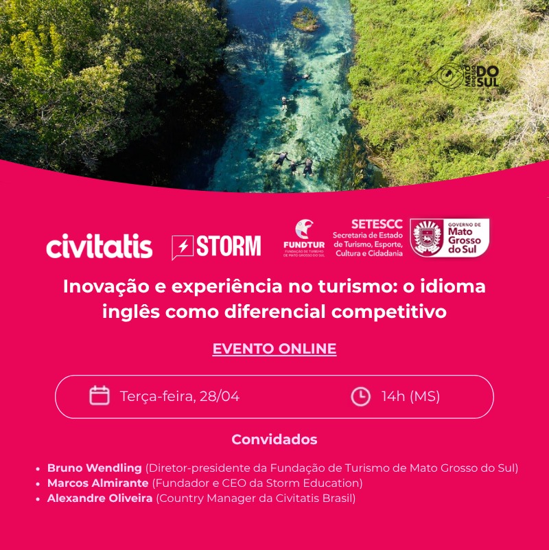 No dia 28 de abril, às 14h (horário de MS), será realizado um Webinar voltado ao setor com o tema “Inovação e experiência no turismo: o idioma inglês como diferencial competitivo”. O encontro reunirá especialistas e lideranças das três instituições para discutir estratégias de inovação, distribuição digital de experiências e qualificação profissional, com foco na ampliação da competitividade do destino.