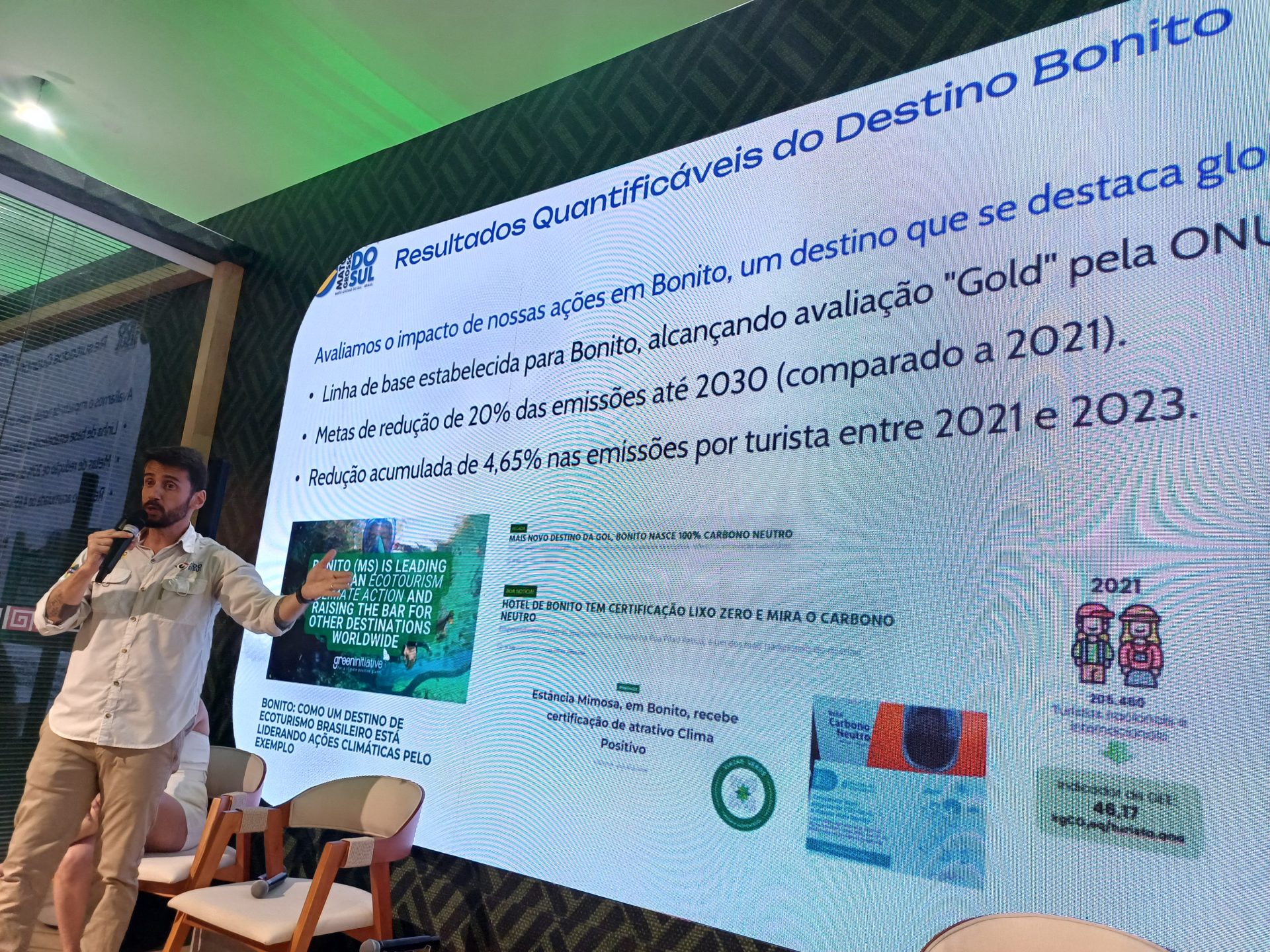 Durante o painel ‘Iniciativas locais e soluções na Ação Climática no Turismo’ realizado na Greenzone, o diretor-presidente Bruno Wendling apresentou dados que reforçam a liderança de Bonito como destino global de ecoturismo responsável. O município completou seu terceiro ciclo de inventário de emissões e alcançou, entre 2021 e 2023, redução acumulada de 4,65% nas emissões por turista. O indicador de eficiência caiu de 46,17 para 44,02 kgCO2eq no período, mesmo com o aumento do fluxo de visitantes. Bonito também já compensou 1.380 toneladas de CO2 equivalente, abrangendo totalmente os escopos 1, 2 e 3, e mantém a meta de reduzir em 20% suas emissões até 2030. Esses resultados consolidam a certificação de Bonito como o primeiro destino de ecoturismo carbono neutro do mundo e como eixo estruturante de uma política climática estadual aplicada ao turismo.